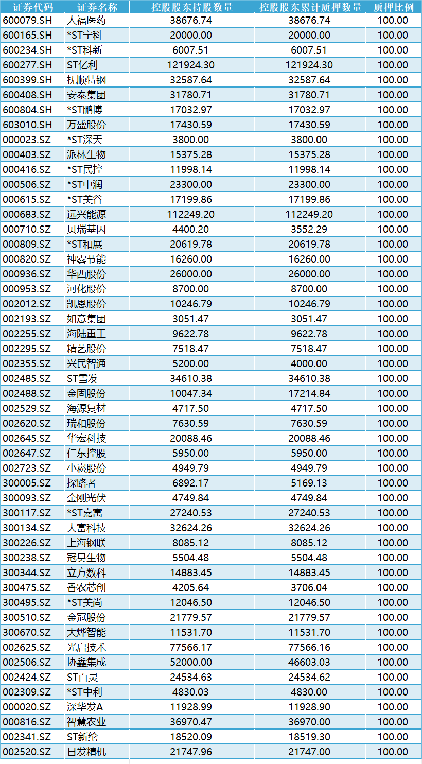 根据Infind统计显示,截至5月30日,384家公司的第一大股东累计质押数占持股数比例超过60%,有50家公司满仓质押。在满仓质押的上市公司中,值得注意的是,其中有15家上市公司为ST公司。