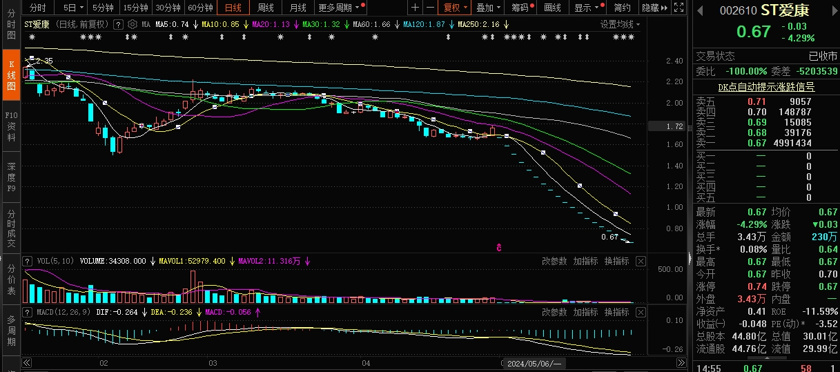 以ST爱康为例,公司股价连续19个交易日跌停。截至5月30日收盘,ST爱康报0.67元,5月6日至今累计跌幅61.93%。
