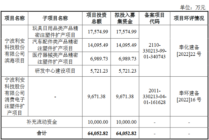 其中,玩具日用品类产品精密注塑件扩产项目、汽车配件类产品精密注塑件扩产项目、医疗器械类产品精密注塑件扩产项目和消费电子注塑件扩产项目投产后,将有助于利安科技实现生产工艺改进,扩大公司整体规模,有效解决公司产能不足的瓶颈。新建生产线预计年产量将达到7830吨注塑件和920个模具,提升公司产品的供应能力,稳固公司行业领先地位。