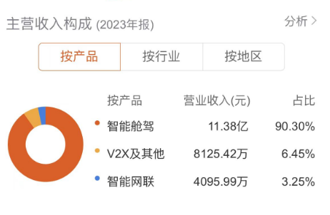 分产品来看,2023年索菱股份的智能舱驾、V2X及其他、智能网联产品实现营收分别为11.38亿元、8125.42万元、4095.99万元,营收占比分别为90.30%、6.45%、3.25%。可以看出,目前索菱股份的营收主要依赖于智能舱驾产品,而其他产品对业绩的贡献仍然较小。从长远发展的角度来讲,这可能也是一个隐患。