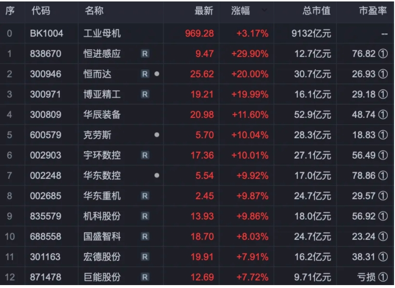 6月25日,工业母机板块逆市领涨,津荣天宇、恒而达、盘古智能实现20CM涨停,博亚精工涨超19.9%,华辰装备涨超14.41%,宇环数控实现10CM涨停。