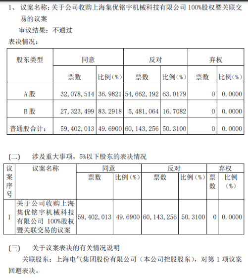 6月24日晚间,上海机电公告上述临时股东大会结果,公司计划斥资53亿元收购上海集优铭宇机械科技有限公司(以下简称“上海集优”)100%股权暨关联交易事项,最终以支持5940.2万股(49.69%),反对6014.33万股(50.31%)的结果遭到股东大会否决。