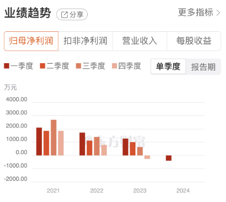 更加令人难以接受的是,线上线下的业绩出现了单季度亏损的情况。2023年第四季度,公司实现归母净亏损263.05万元。2024年第一季度,亏损金额进一步扩大至397.46万元,逐季亏损现象的出现,令众多投资者心生疑惑。