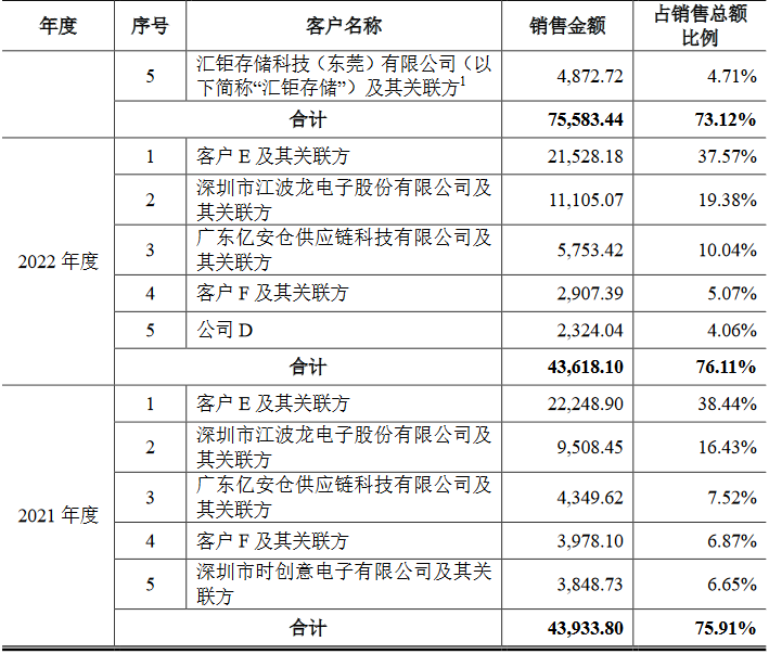 事实上,联芸科技在2023年实现业绩反弹,不得不感谢身为关联方的第一大客户E的帮助。客户E及其下属企业各期销售金额分别为2.22亿元、2.15亿元、3.18亿元,占营收的比重为38.44%、37.57%、30.73%,都超过了30%。