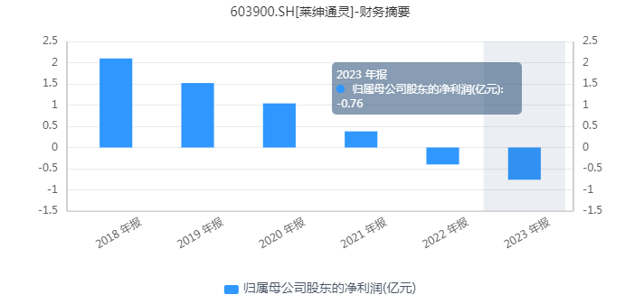 财务数据显示,2018年,莱绅通灵净利润2.1亿元,至2021年已下滑至0.38亿元。2022年,公司出现亏损,2023年公司进一步扩大至7620万元。