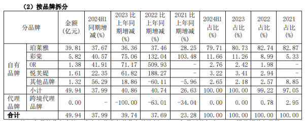品类和品牌看似丰富,但珀莱雅依然十分依赖主品牌“珀莱雅”。今年上半年,其主品牌“珀莱雅”的营收为39.81亿元,同比增长37.67%,占比79.71%,是撑起公司营收的主力。