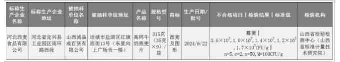 通告显示,标称河北西麦食品有限公司生产的“西麦”高钙牛奶燕麦片(315克(35克×9)/袋,2024/6/22),五件样品检验结果分别为3.6×1000、1.0×1000、1.4×1000、1.2×1000、1.7×1000CFU/g,均出现霉菌超标。而河北西麦食品有限公司为西麦食品的全资子公司。