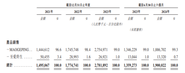 今年上半年,这种“失衡”局面更为突出。据招股书,截至2024年6月30日止六个月,MAOGEPING实现产品销售收入18.87亿元,占总营收的99.3%;至爱终生实现产品销售收入0.13亿元,仅占总营收的0.7%。