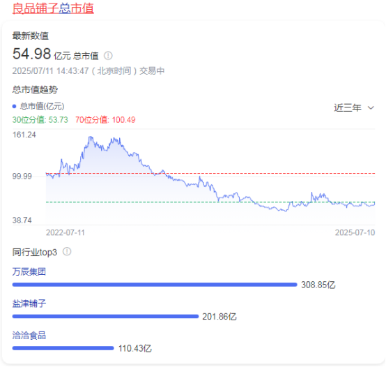 截至7月11日,良品铺子市值只有54.98亿元,与高峰期的300多亿元相比,缩水超80%。