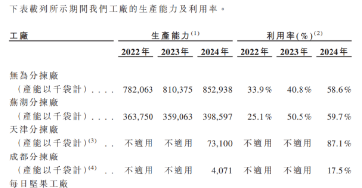 更为重要的是,不论是新品牌的孵化、还是产能扩建以及全渠道发力,均需要时间和资金的持续投入。产能扩建方面,招股书披露,公司计划在2025—2026年推进产能扩建,其中针对坚果类产品的投资预计为2.5亿元,针对零食等其他类别的投资预计为2.2亿元。