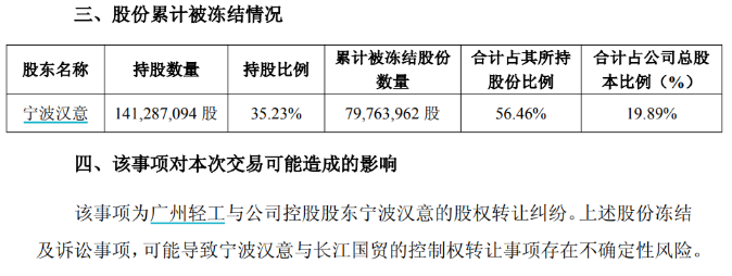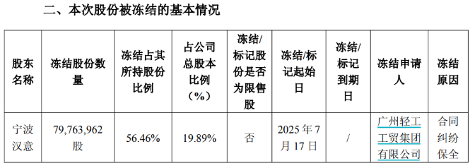 业绩低迷之际,控股股东宁波汉意也萌生退意。公司7月17日晚间公告称,控股股东宁波汉意及其一致行动人良品投资拟向长江国贸转让合计所持上市公司21%的股份,前述交易完成后,公司控股股东将变更为长江国贸,实际控制人变更为武汉国资委。值得注意,由于宁波汉意所持有的19.89%公司股份处于被冻结状态,这为此次交易蒙上了一层不确定性,而股份被冻结的原因系宁波汉意和另一国资企业之间存股权转让纠纷。实控权层面的动荡与业绩不振交织,或令公司经营陷入“内忧外患”的双重压力。