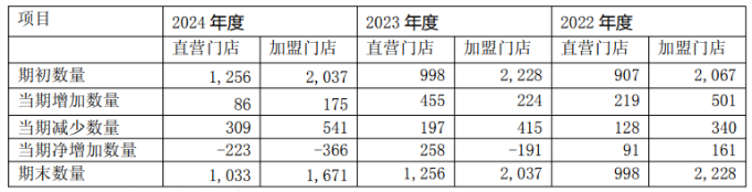 然而2023年,良品铺子加盟店和自营店的增长情况却呈现出分化:直营店净增长258家,加盟店净减少191家;2024年,公司门店数量进一步收缩,报告期内直营店和加盟店数量分别净减少223家和366家,截至2024年末,公司线下门店总计2704家,相较2022年的3226家呈现大幅收窄。