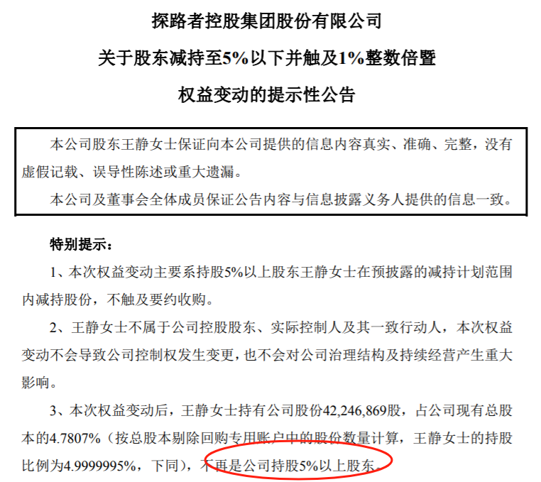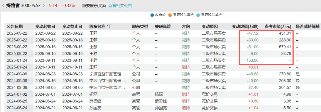 9月22日,探路者(300005.SZ)一则简式权益变动报告书再次打破市场平静,创始人之一王静在9月15日至22日间再次减持147.52万股,持股比例从5.17%降至4.99%,正式退出5%以上股东行列。据wind数据,累计减持金额约1403万元。虽然金额不大,但从本月接二连三的减持行动来看,创始人家族套现离场似乎更加坚决了。