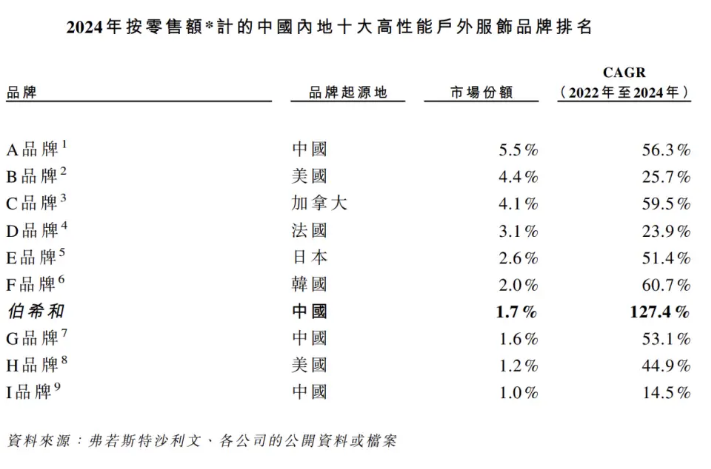 (图源伯希和招股书,媒体推测:A品牌为骆驼,G品牌为凯乐石,I品牌为本司)