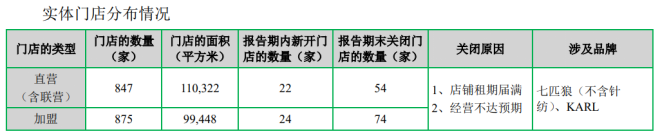 销售额的萎缩和加盟商的更迭,一定程度释放出七匹狼加盟体系信心松动的信号。此外,从门店净增长数量也可以看出,上半年,七匹狼加盟店关闭门店74家,远高于24家新开门店,闭店原因与店铺租期届满以及经营不达预期有关。