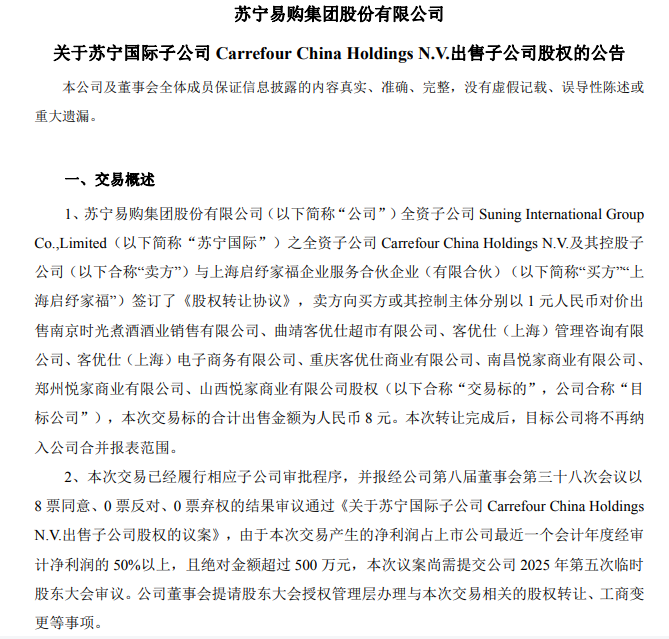 2025年12月10日,苏宁易购公告显示,Suning International GroupCo.,Limited(苏宁国际)之全资子公司Carrefour China Holdings N.V.及其控股子公司与上海启纾家福企业服务合伙企业(有限合伙)签订了《股权转让协议》,分别以1元人民币对价出售南京时光煮酒酒业销售有限公司、曲靖客优仕超市有限公司、客优仕(上海)管理咨询有限公司、客优仕(上海)电子商务有限公司、重庆客优仕商业有限公司、南昌悦家商业有限公司、郑州悦家商业有限公司、山西悦家商业有限公司股权,本次交易标的合计出售金额为人民币 8 元。