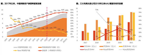 最后电商行业本身已经进入存量博弈阶段。随着我国零售电商市场的不断发展,网络购物用户数逐渐逼近中国网民总数,2021年电商渗透率超80%。随着各家宣传与补贴的发展,电商用户也出现大量重叠的情况,由于用户在不同电商平台之间的转移成本较低,三家头部电商均面临用户增速回落的情况。