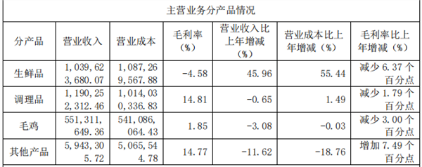 从产品结构看,财报显示,春雪食品三类主营产品毛利率均同比出现下滑。春雪食品解释称,业务毛利率变动主要是本年度鸡苗采购价格同比上涨较大,导致养殖成本增加,同时受供需关系、消费低迷及猪肉价格长期低位影响,鸡肉生鲜品价格处于盈亏平衡点以下,导致农副食品加工业、畜牧业、生鲜品、毛鸡、线上、省内、省外销售毛利均有所减少。