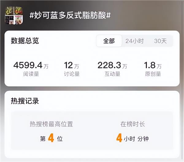 据南方都市报报道,5月9日,知名奶酪品牌妙可蓝多官宣艺人王一博正式成为其品牌形象代言人,妙可蓝多品牌即食营养系列产品全新上市。但紧随而来的是其迅速陷入产品含有“反式脂肪酸”的质疑中。当日,妙可蓝多“含有反式脂肪酸”的话题也冲上微博热搜。截至目前,妙可蓝多官方还未正式回应。