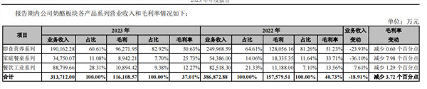 报告期内公司即食营养系列实现收入 190,162.28 万元,同比下降 23.93%,但其中常温奶酪棒受益于渠道拓展和场景破圈实现逆势上涨;家庭餐桌系列在去年同期高基数影响下收入有所回落,实现营业收入 34,750.07 万元,同比下降 36.10%。而餐饮工业系列凭借公司供应链及专业化服务优势和餐饮消费场景复苏,实现收入 88,799.66 万元,同比增长 7.61%。