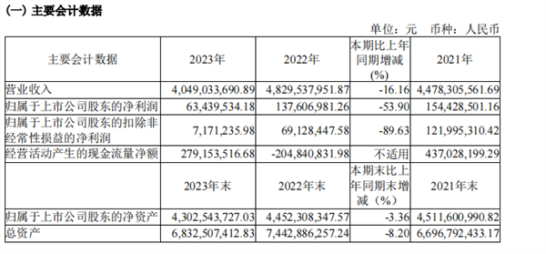 根据妙可蓝多披露的2023年度财报数据显示,报告期内公司实现营业收入约40.49亿元,同比减少16.16%;归属于上市公司股东的净利润约6344万元,同比减少53.9%。