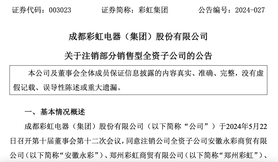 5月23日,成都彩虹电器发布公告,宣布注销7家全资子公司,以优化资源配置并提高运营效率,引发市场关注。