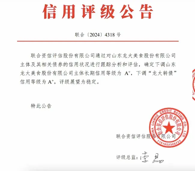 曾经风光无限的龙大美食,如今却陷入了亏损和降级的泥沼。6月14日,联合资信公告称,将龙大美食主体及“龙大转债”信用等级由“AA-”下调至“A+”,评级展望稳定。