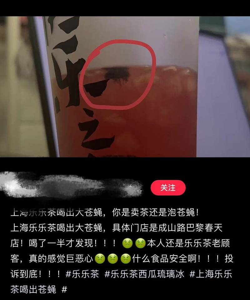 6月30日晚间,有消费者发帖称,在上海乐乐茶成山路巴黎春天店购买了一款饮品,喝到一半却发现杯内有一只大苍蝇。