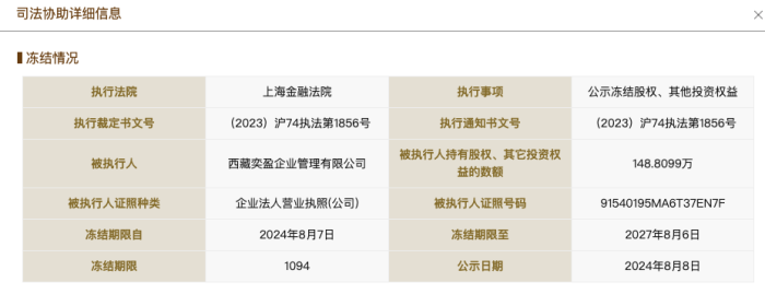 据国家企业信用信息公示系统网站显示,8月8日,乐乐茶关联公司上海茶田餐饮管理有限公司新增一则股权冻结信息,股权被执行的企业为该公司,被执行人为该公司股东西藏奕盈企业管理有限公司,冻结股权数额为148.8万元,冻结期限自2024年8月7日至2027年8月6日,执行法院为上海金融法院。