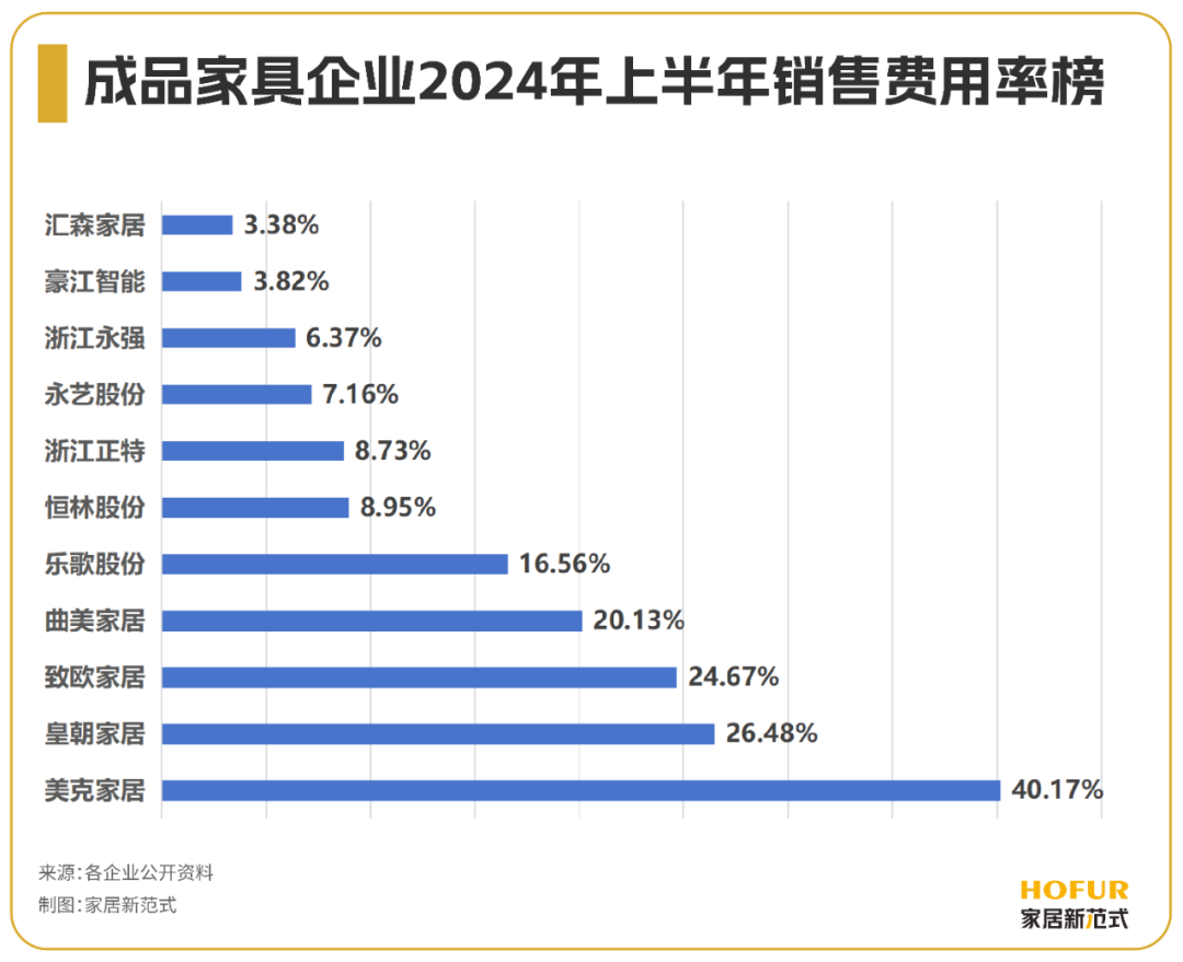 在销售费用方面,11家成品家具上市企业的销售费用率均值为15.13%,较2023年略低,与定制家居行业大致相当。