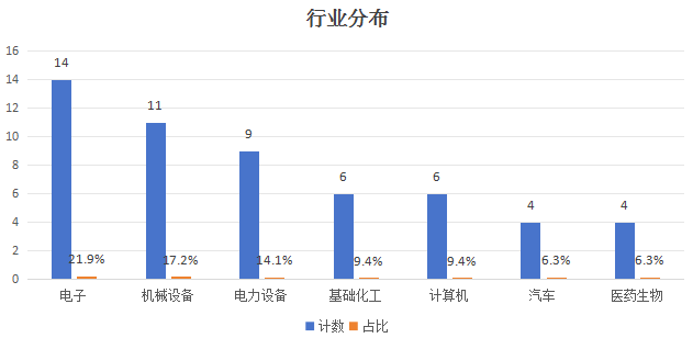 从申万一级行业分布看,今年64家新上市公司分布在电子、机械设备、电力设备、基础化工、计算机、汽车、医药生物、国防军工、美容护理、环保、家用电器、农林牧渔、轻工制造、通信等14个行业。其中,电子、机械设备两个行业集中度较高。
