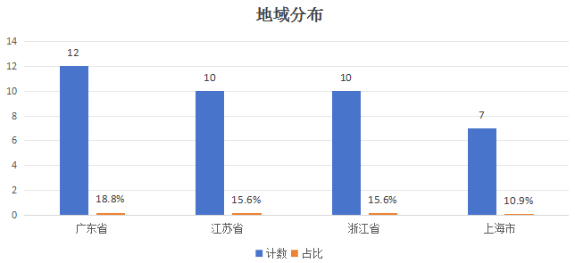 从地域分布看,今年64家新上市公司分布在广东、江苏、浙江、上海、福建、湖北、安徽、北京、山东、四川、河北、河南、陕西等13个省市。其中,广东以12只新股的数量位列第一;江苏、浙江并列第二,均有10只新股。