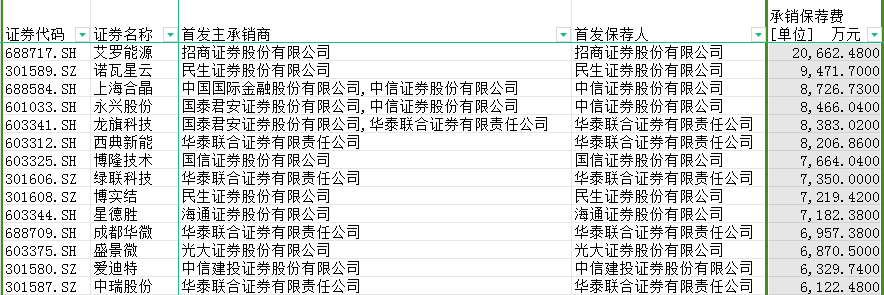 其中,海通证券、中信建投证券、中信证券各有6单。值得关注的是招商证券,今年以来揽下了一个大单。艾罗能源出手极其“阔绰”,其上市承销保荐费高达近2亿元。