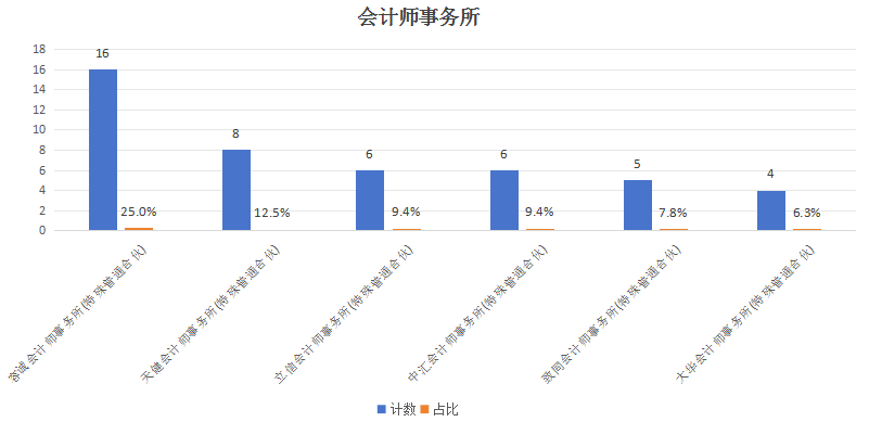 从会计师事务所看,今年64家新上市公司花落于容诚、天健、立信、中汇、致同、大华、公证天业、普华永道中天、上会、天职国际、信永中和、中天运、中兴华、安永华明、华兴、立信中联、永拓、中审众环等18家会计师事务所。