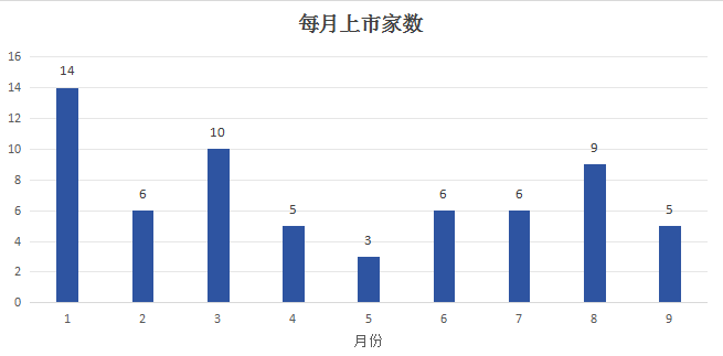 从时间分布看,集中在1月份,有14只新股上市。随着监管政策的陆续发布,新股上市速度持续收紧,5月份仅有6只新股上市,6月、7月有6只新股上市,8月份逐渐回暖,有9只新股上市。9月以来,已有5只新股上市。