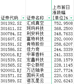 同花顺数据显示,今年64家新上市公司中,上市首日涨幅超过200%的有12只,分别是汇成真空、珂玛科技、利安科技、富特科技、肯特股份、佳力奇、中草香料、宏鑫科技、中仑新材、万达轴承、国科天成、诺瓦星云。其中,汇成真空上市首日涨幅更是高达753%。