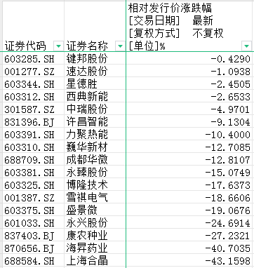 相较之下,截至9月13日收盘,已有17家公司股价相对发行价出现跌幅。