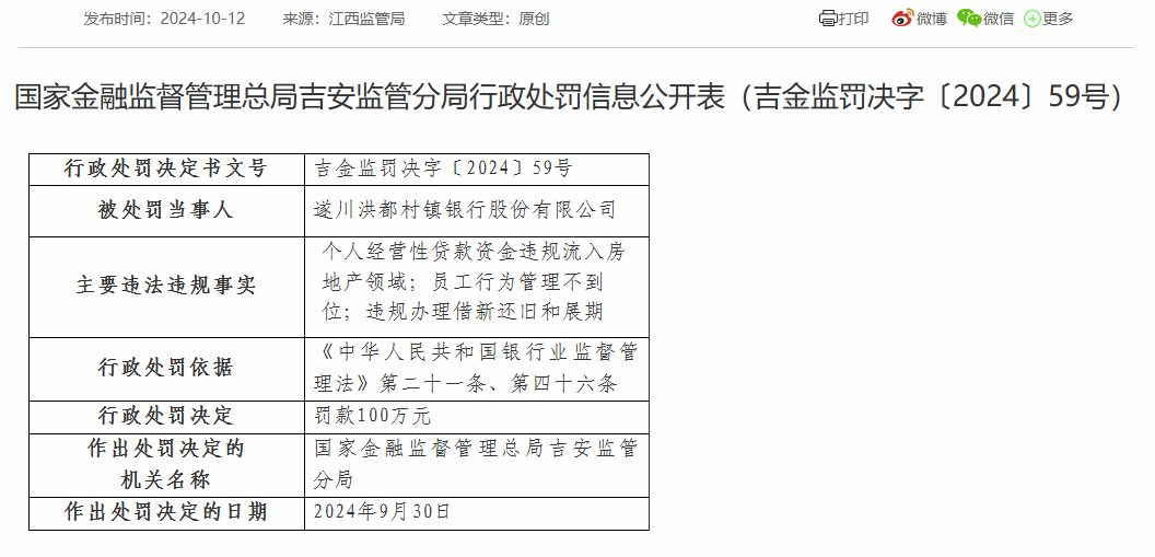 日前,国家金融监督管理总局吉安监管分局行政处罚信息公开表显示,遂川洪都村镇银行因个人经营性贷款资金违规流入房地产领域;员工行为管理不到位;违规办理借新还旧和展期,被罚款100万元。上述处罚决定作出的日期为2024年9月30日。