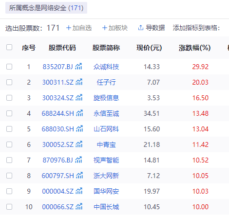 10月17日,网络安全概念全天领涨,众诚科技、任子行、中国长城、国华网安、常山北明、川大智胜、润和软件等纷纷大涨。