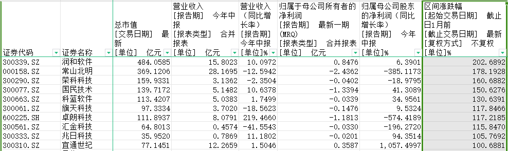 从区间涨跌幅表现看,近一个月涨幅超过100%的有10家上市公司,分别是润和软件、常山北明、荣科科技、国民技术、科蓝软件、旗天科技、卓朗科技、汇金科技、兆日科技、宜通世纪。