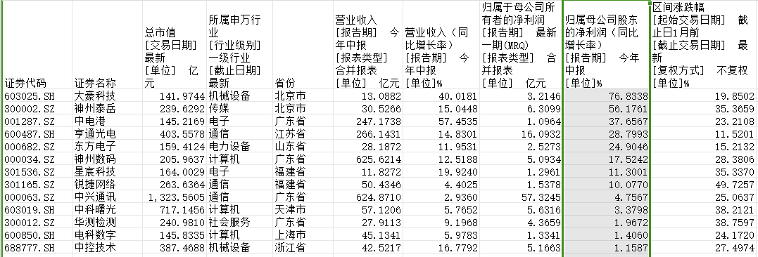 从业绩表现看,今年上半年,在网络安全概念171家上市公司中实现归母净利润为正的公司有83家。其中,上半年归母净利润超过一个亿,且营业收入和归母净利润实现同比增长的只有13家,分别是大豪科技、神州泰岳、中电港、亨通光电、东方电子、神州数码、星宸科技、锐捷网络、中兴通讯、中科曙光、华测检测、电科数字、中控技术。
