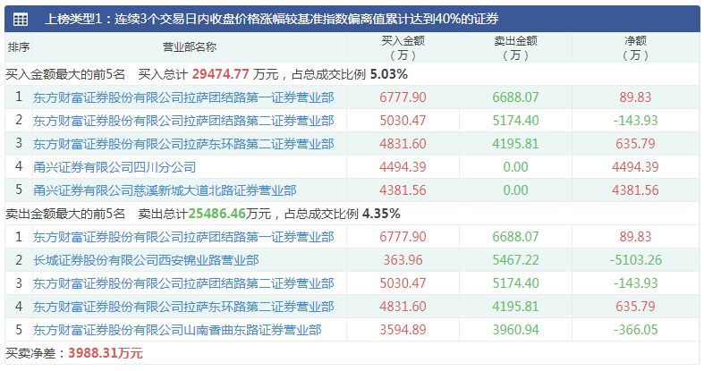 2024年10月21日,艾融软件因连续3个交易日内收盘价格涨幅较基准指数偏离值累计达到40%登上龙虎榜。其中,在买入金额最大的前5名营业部和卖出金额最大的前5名营业部中,均出现了东方财富拉萨团结路第一证券营业部、东方财富拉萨团结路第二证券营业部、东方财富拉萨东环路第二证券营业部“拉萨天团”。