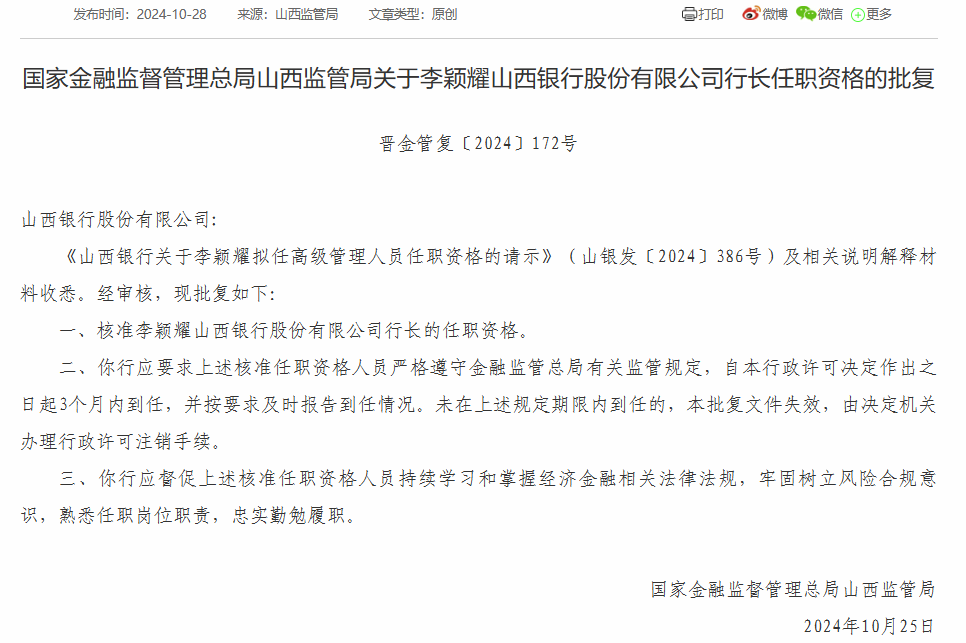 10月28日,国家金融监督管理总局网站发布的行政许可文件显示,山西金融监管局核准李颖耀山西银行股份有限公司行长的任职资格。批复时间为2024年10月25日。
