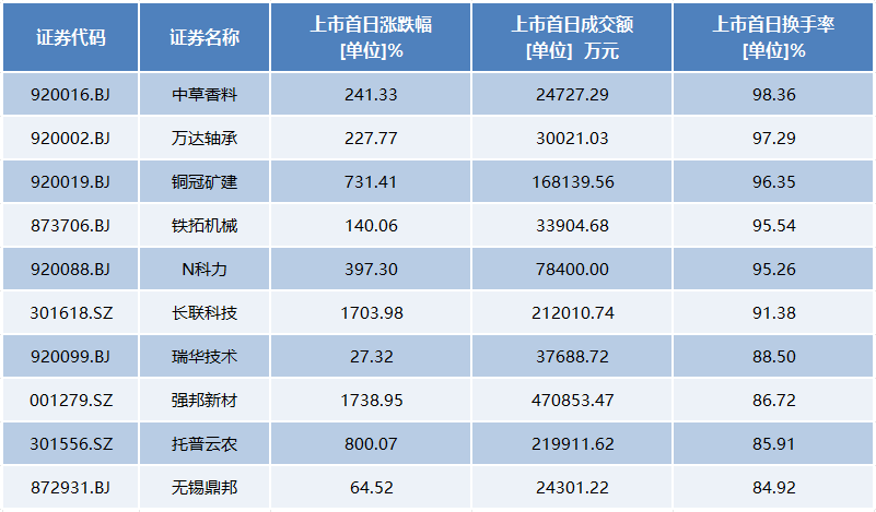 具体来看,主板涨幅最高的前三名分别是强邦新材、广合科技、小方制药,涨幅分别为1738.95%、197.65%、167.04%。创业板涨幅最高的前三名分别是长联科技、上大股份、托普云农,涨幅分别为1703.98%、1060.61%、800.07%。科创板涨幅最高的前三名分别是N拉普、达梦数据、欧莱新材,涨幅分别为286.3%、176.91%、169.48%。北证涨幅最高的前三名分别是铜冠矿建、N科力、中草香料,涨幅分别为731.41%、397.3%、241.33%。