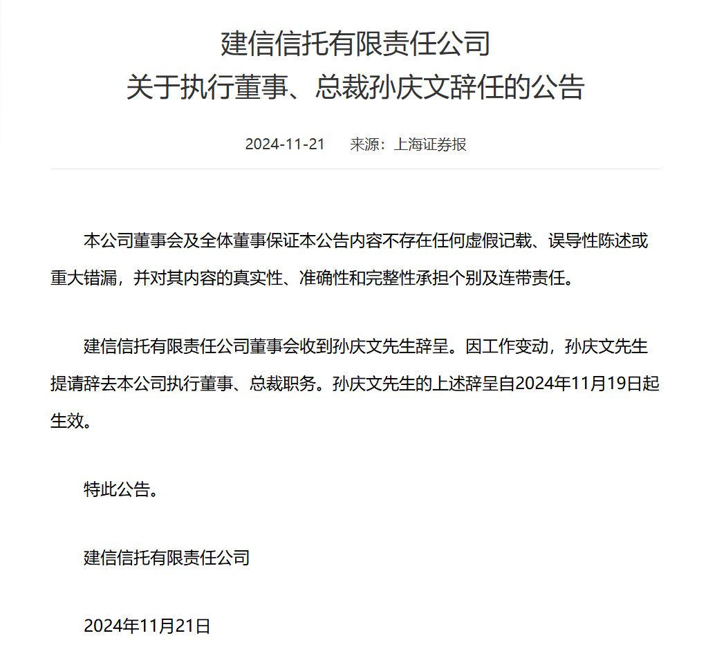 日前,建信信托有限责任公司(简称:建信信托)发布相关公告表示,其董事会收到孙庆文辞呈,因工作变动,孙庆文先生提请辞去本公司执行董事、总裁职务。孙庆文的上述辞呈自2024年11月19日起生效。