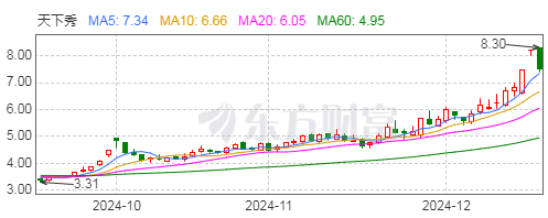 12月17日,天下秀发布股票交易风险提示公告,公司股票于12月11日、12月12日、12月13日连续三个交易日内收盘价格涨幅偏离值累计超过20%。12月16日,公司股票再次以涨停价收盘,连续4个交易日累计涨幅达到31.47%。