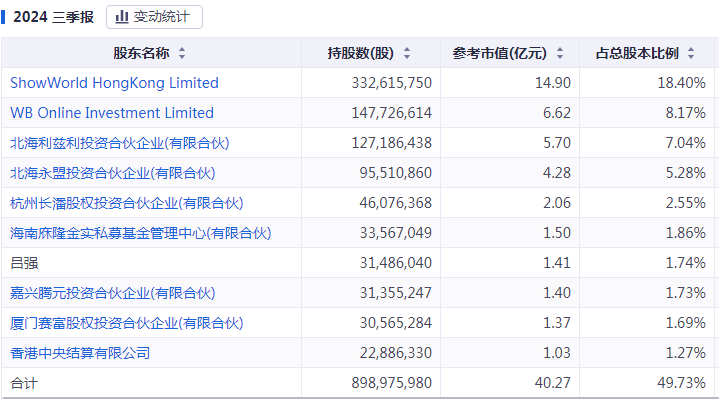 上表中,Show World Hongkong Limited、WB Online Investment Limited实控人为新浪集团;北海利兹利投资合伙企业(有限合伙)、北海永盟投资合伙企业(有限合伙)的控股股东和实控人是李檬。