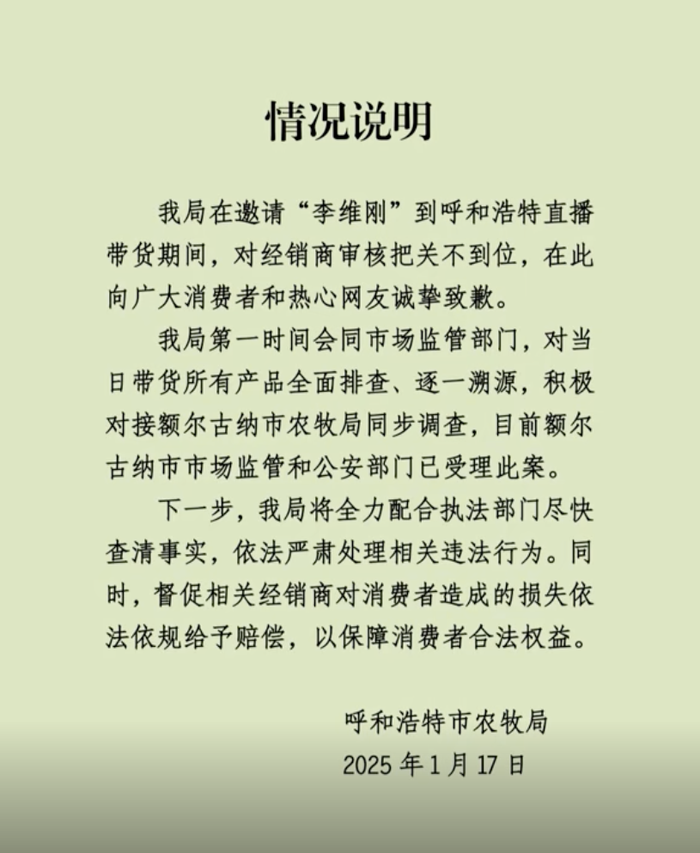 1月17日晚,呼和浩特市农牧局发布情况说明称,该局在邀请“李维刚”到呼和浩特直播带货期间,对经销商审核把关不到位,在此向广大消费者和热心网友诚挚致歉。