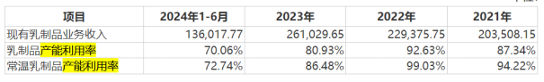 2024年开始,乳制品行业供需失衡情况进一步显现,根据天润乳业2024年10月更新的募资说明书,公司2023年乳制品和常温乳制品的产能利用率已经较上年同期大幅下滑11.7个百分点和12.55个百分点至80.93%和86.48%,而至2024年上半年,前述乳制品的产能利用率进一步下滑为70.06%和72.74%。