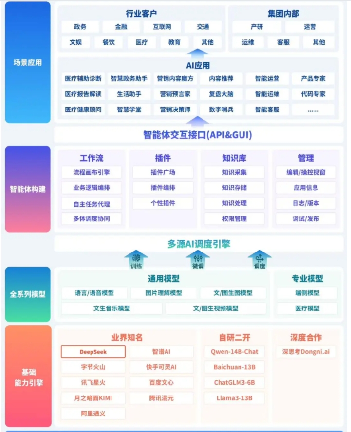 其中,“1”代表一个智能体交互接(API&GUI);“N”代表专用大模型体现在多源AI调度引擎中的通用模型和专业模型,包括语言模型、文生音乐模型、图片理解模型、文/图生视频模型、医疗模型等;“X”代表原生场景对应于行业客户和集团内部的多个应用场景,如政务、金融、互联网、交通、产研、运营、文娱、餐饮、医疗、教育等。